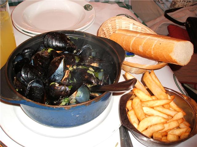 一鍋淡菜附上可以免費續點的薯條和法國麵包再加上一杯冰涼的啤酒