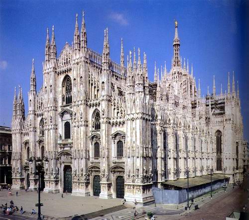 4.哥德式:13~15世紀.尖形塔頂.肋柱拱.扶壁.大型彩繪玻璃窗---義大利米蘭大教堂