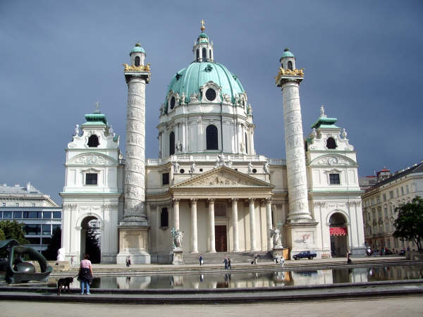 6.巴洛克式:17~18世紀.華麗.圓曲線條---維也納卡爾教堂