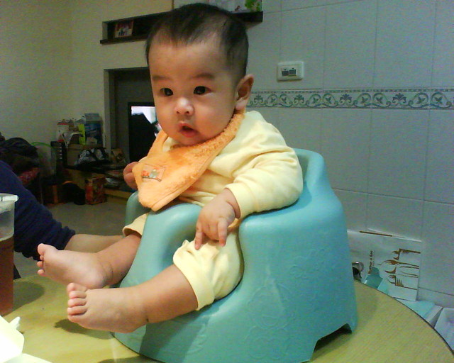 家裡的新成員不知不覺已經四個多月了 看到Judylo在荷蘭用的Bumbo椅好像很方便的樣子 也從網路上訂了一個給阿昇 他可以就這樣坐在桌上看大家吃飯 真的超有趣的... 適用於4個月~1歲的小朋友 我想可能是因為這時候小鬼們開始學會翻身 變成不能不時時刻刻盯著的小惡魔了吧 有了這個...大人們就可以好好吃頓飯囉